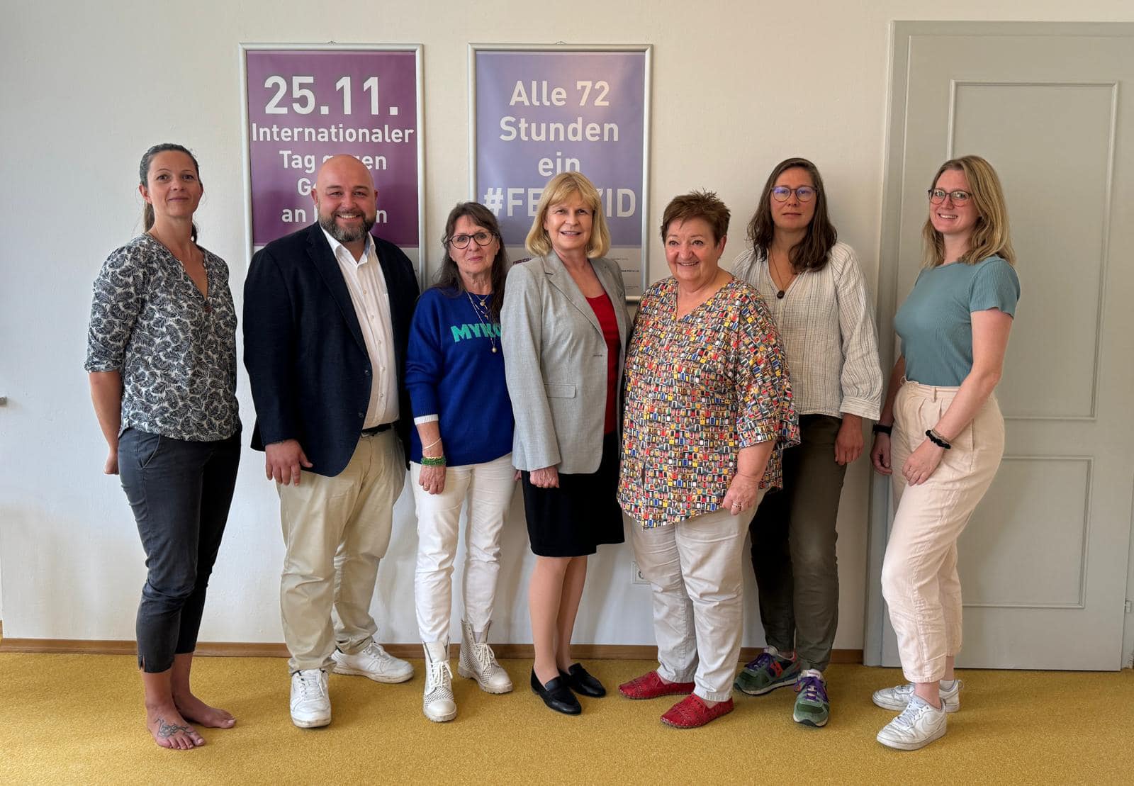 Die Vorständin Bettina Lesch-Lasaridis verweist darauf, dass dies Aufgabe der öffentlichen Hand ist. Sie fordert deshalb nicht umsonst, „den Schutz von Opfern häuslicher Gewalt und die Einrichtung von Beratungsstellen und Frauenhäusern“ im Gesetz zu verankern. Der Verein „Keine Gewalt gegen Frauen e.V.“ ist Träger der Einrichtungen und muss vom Gesamthaushalt 10 Prozent selbst erwirtschaften. Aktuell macht dies ca. 50.000 Euro pro Jahr aus. Geld, das unter anderem durch Mitgliedsbeiträge und Spenden erwirtschaftet werden muss. Das Frauenhaus ist in die Jahre gekommen und stark renovierungsbedürftig, ein Neubau war unumgänglich. Die Miete, die zukünftig gezahlt werden muss, wird ein Dreifaches betragen. Für in Aussicht gestellte Fördermittel muss in Vorkasse gegangen werden. Die Krux dabei: Die Erhöhung der Kosten, verbunden mit der Zehn-Prozent-Klausel, wird den jetzt schon kaum stemmbaren Selbstaufwand eklatant erhöhen. „Steigende Kosten entsprechen einem steigenden Eigenanteil“, mahnt Vorständin Angela Platsch (3. von rechts). Eine Möglichkeit, Kosten zu minimieren, wäre, den prozentualen Eigenanteil der Träger zu senken – und, dafür wollen wir uns einsetzen.
