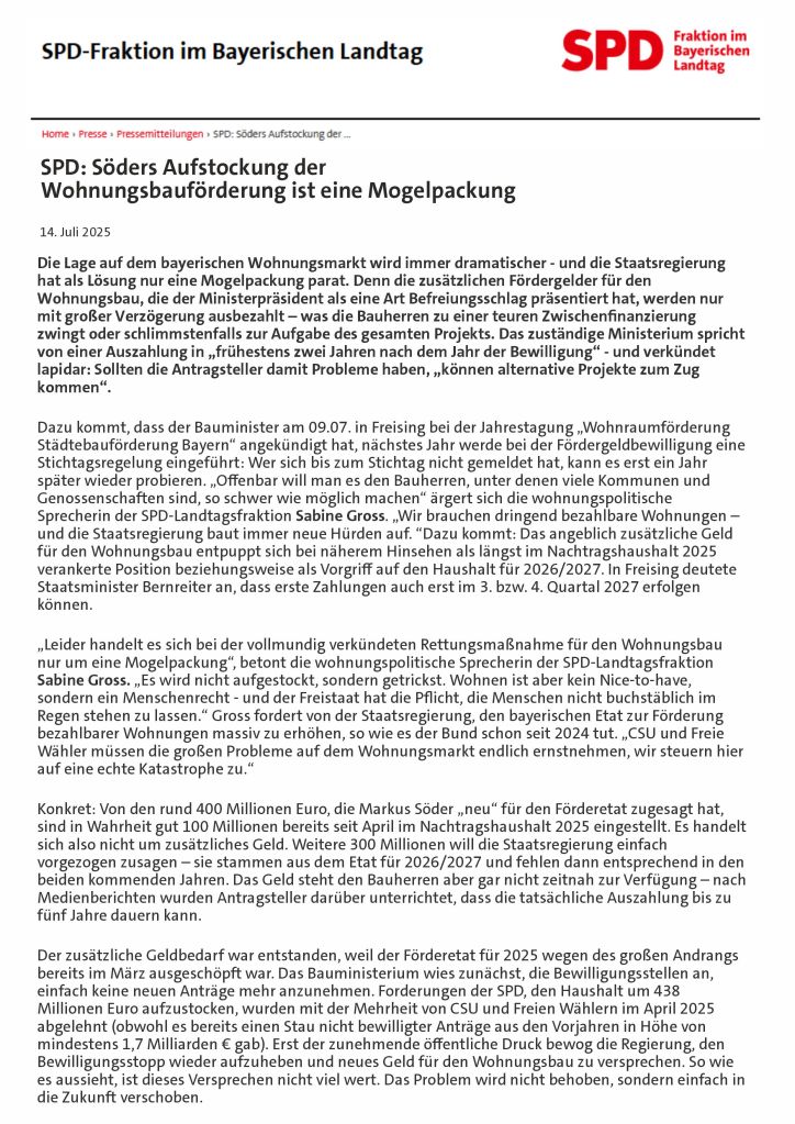 Anbei ein paar Hintergrundinformationen und Links zu unserer Pressemeldung über die Aufstockung der Wohnungsbauförderung der SPD-Fraktion im Bayerischen Landtag.